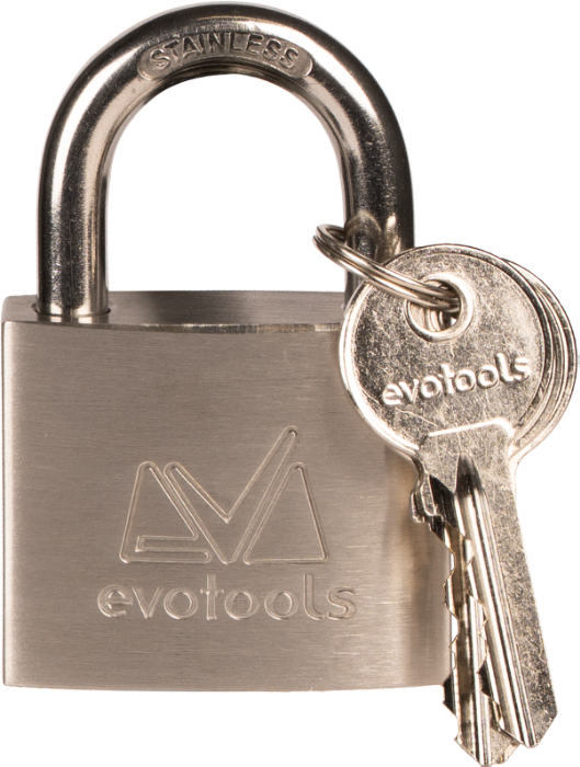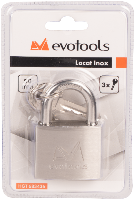 Lacăt inox Evotools, cu corp din oțel inoxidabil și cilindru din alamă. Include 3 chei din alamă, oferind securitate ridicată, durabilitate și rezistență la coroziune pentru utilizare în interior și exterior.