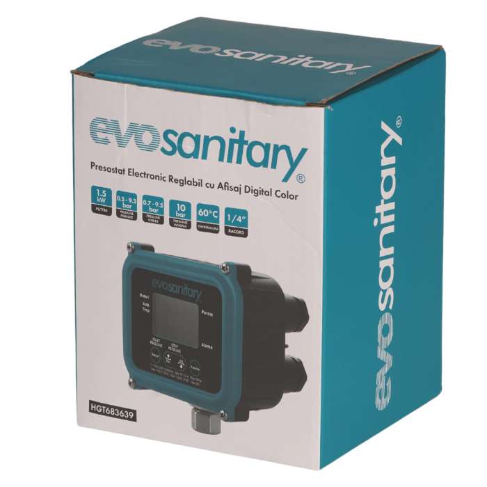 Presostatul electronic Evosanitary este o soluție modernă și fiabilă pentru controlul automat al pompelor de apă în instalații casnice sau industriale. Echipat cu un afișaj digital color, acest dispozitiv oferă o interfață intuitivă pentru reglajul și monitorizarea presiunii în timp real, asigurând un control precis și eficient al sistemului hidraulic.