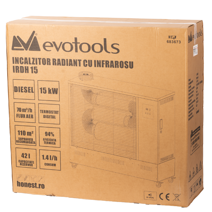 Încălzitorul Radiant cu Infrarosu Diesel Evotools IRDH de 15 kW este o soluție robustă și sigură pentru necesarul dumneavoastră de încălzire, combinând performanța înaltă cu funcții de siguranță esențiale.