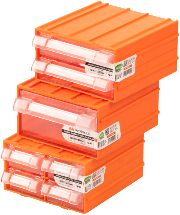 Sertar galben modular Evotools, realizat din plastic durabil, ideal pentru depozitarea și organizarea pieselor mici, șuruburilor și accesoriilor. Sistemul modular permite combinarea și extinderea sertarelor, oferind flexibilitate și ordine maximă în atelier sau garaj.