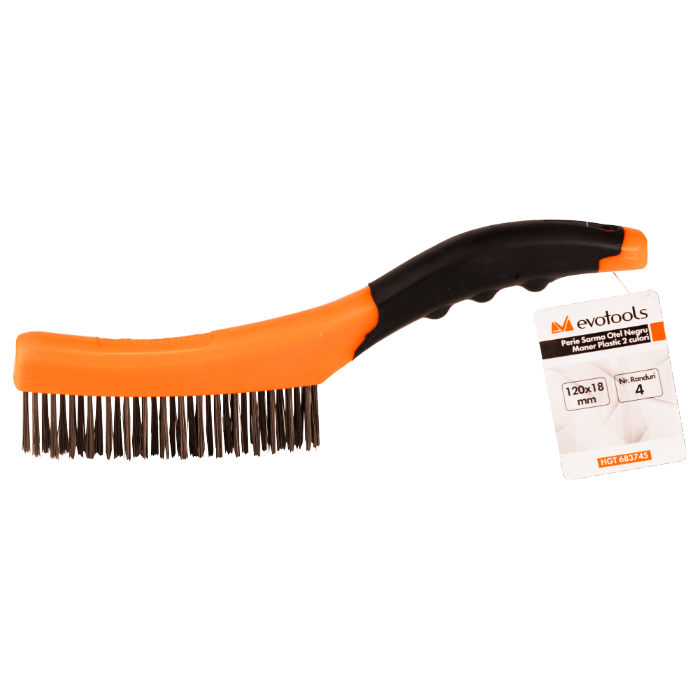 Leírás:Drótkefe Fekete Acélból, Műanyag Nyél, 2 Szín / L[mm]: 120; l[mm]: 18; N[sorok]: 4
